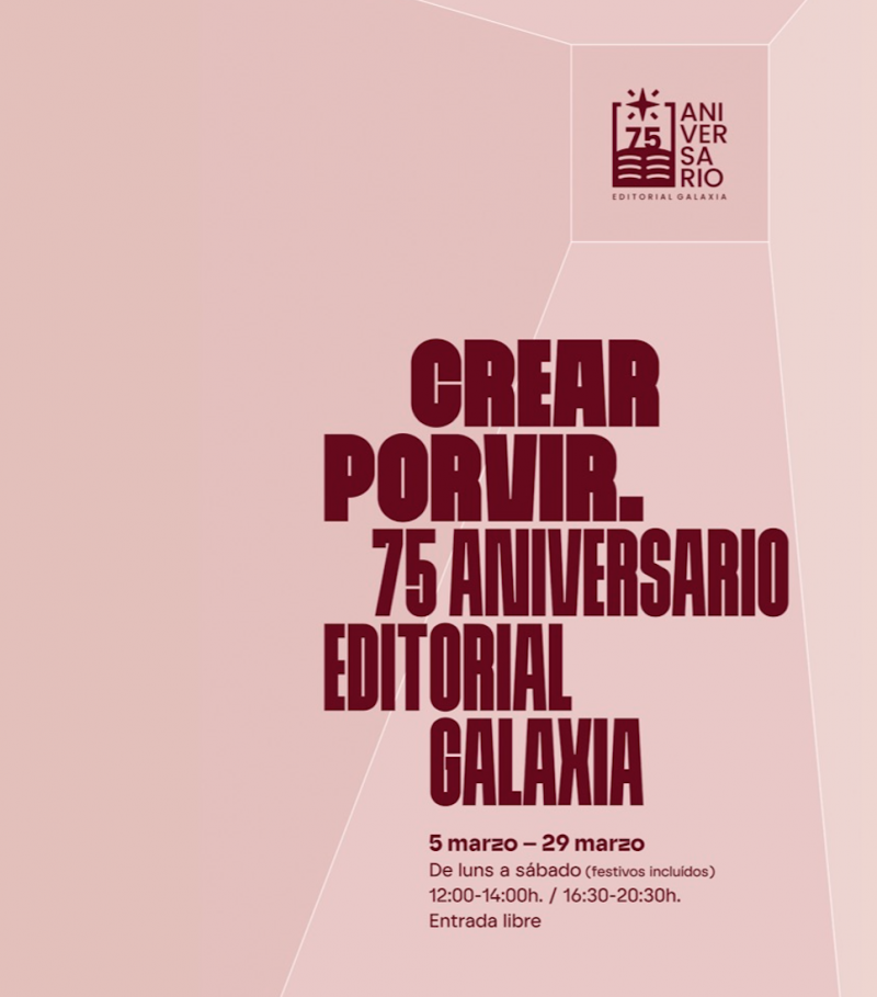 La exposición «Crear porvir. 75 aniversario de Editorial Galaxia” recorrerá Galicia a lo largo de 2025, haciendo escala en las siete grandes ciudades gallegas. Comienza en este mes de marzo en la Sede Afundación de Santiago de Compostela, para continuar en abril y mayo en el Pazo Provincial de Lugo, y en mayo y junio en la Sala de Exposiciones Afundación de Ourense. En julio, la muestra llegará a Ferrol, también en la Sede de Afundación, y, tras el verano, se instalará en septiembre y octubre en el Café Moderno Afundación de Pontevedra. A Coruña acogerá la exposición entre octubre y noviembre en la Fundación Luís Seoane, finalizando su itinerario en Vigo, donde podrá visitarse entre diciembre de 2025 y enero de 2026 en la Sede Afundación de la ciudad.