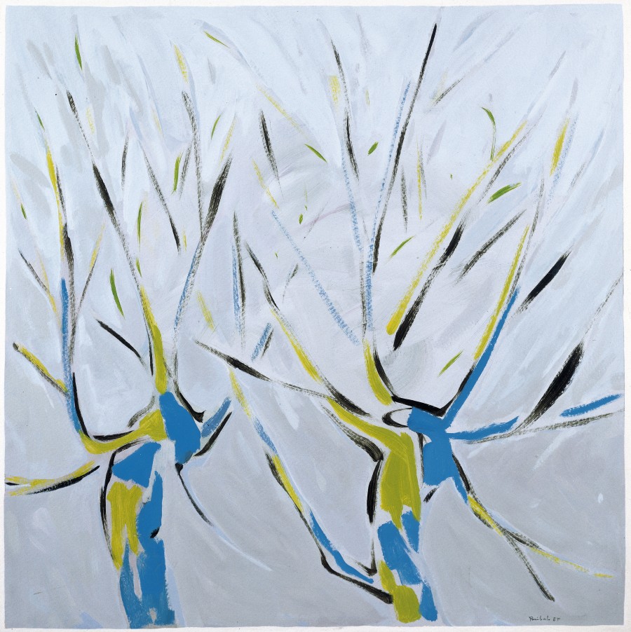 Dos árboles, esquemáticos, desnudos, ocupan toda la composición. Pero no es el tema lo más importante del cuadro. El blanco del fondo inunda el espacio pictórico creando un universo de luz, en el que las ramas se expanden con fresca espontaneidad, definidas con gestos espontáneos, manchas controladas e intuiciones de pincel; en donde el trazo negro hace vibrar al azul y al verde, conjugando lo lúdico y lo poético con la intensidad característica del artista.
