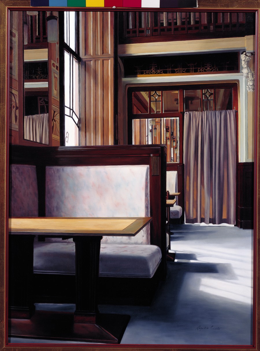 Perspectiva del interior de un café con ventanales, por donde entra la luz, y espejos que desdoblan los planos de la estacia captando un ámbito impregnado de lirismo y de nostalgia. Con gran realismo, aplicando una técnica de reflejos y veladuras, aprehende un ambiente solitario, romántico y evocador, con orquestada gama de grises, amarillos, marrones y verdes.Exposiciones