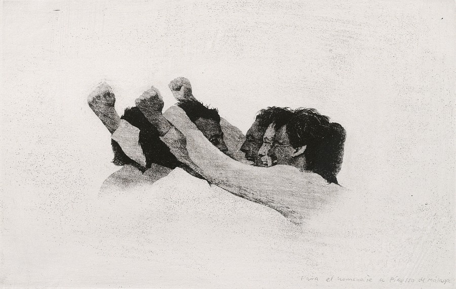 Formó parte del grupo “ Hondo “ ( 1961 ) que afirmaba la adscripción del artista a la función social y política del arte. De 1977 a 1982 militó en el PCE. Su espíritu crítico y de denuncia social se refleja en sus creaciones. De unos primeros momentos abstractos pasa en los 60 y 70 a representar masas de gente anónima que huyen a la carrera avistadas como con teleobjetivo con un lenguaje narrativo nuevo que se alejaba de la expresión realista de los artistas comprometidos políticamente. Ya en los 80 comienza a hacer obras de realización minuciosa con una técnica de “desaparición por difuminado” como él mismo comenta. En este homenaje a Picasso la gente son sólo cabezas con un brazo levantado que gesticulan en posturas contrapuestas con la fuerza de un lenguaje realista, particular y característico, que la utilización del blanco y el negro acentúa.