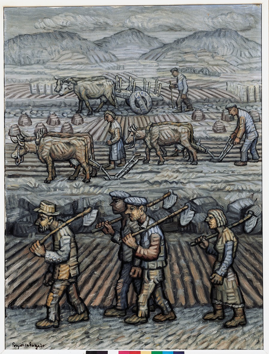 Pinta Pesqueira campesinos en un paisaje de caminos entre campos roturados y montañas. Sus personajes son labradores que trabajan en el campo o transitan por los caminos de regreso a sus casas después de haber realizado las faenas del día. Con gran sensibilidad y espíritu poético se acerca a la vida rural gallega que plasma en sus cuadros con originalidad en las texturas, el color y el dibujo, sin ningún tipo de deje folclórico, otorgando a sus personajes un valor universal.Exposiciones