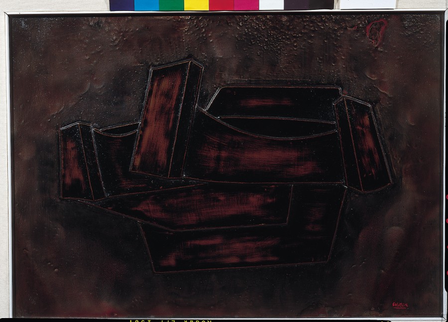Los motivos de esta serie proceden de dibujos y esquemas que se traducen en cuerpos geométricos que destacan en relieve sobre el espacio que se crea en la lámina de hierro. La sensibilidad de Solveira para la armonía y el equilibrio de los cuerpos en el espacio le lleva a transformar su repertorio de formas en volúmenes de elegante diseño con un acorde de marrones, rojizos y negros.