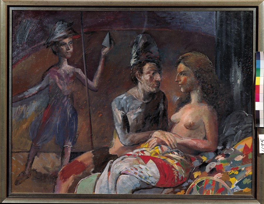 El mundo del circo que tanto atrajo a los artistas de Montmatre desde Seurat hasta Picasso es tratado por X.L. de Dios en una serie de obras que el artista dedica a este tema. Escoge aquí el mundo de los arlequines por las posibilidades plásticas que este personaje de la comedia del arte ofrece. Sitúa a las figuras en un espacio, determinado por la cortina y la sinuosa curva de la pista del circo, dividido verticalmente por el bastón del arlequín. Y empieza la pantomima, Arlequín enamorado se acerca a la figura femenina, tumbada semidesnuda sobre el borde del cuadro mientras el joven arlequín con un armonioso movimiento extiende el brazo con una pequeña pirámide en la mano. Creador de exquisita sensibilidad logra un conjunto de gran riqueza plástica, en el que dominan grises y rojizos salpicados de amarillos, rosas y azules.