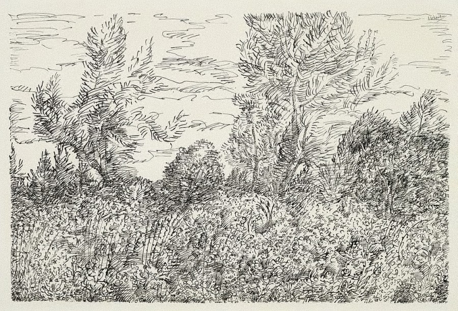 Signos, vírgulas y arabescos surgen de forma aleatoria sobre el papel ocupando el primer término, la zona que precede a los árboles, dibujados como estructuras móviles en extraño diálogo. Es el fragmento de un paisaje que conoce bien, al que ha dedicado varias series de dibujos y pinturas, lo que le permite detenerse en distintos motivos dando rienda suelta a sus pensamientos y emociones con una ejecución rápida y libre.