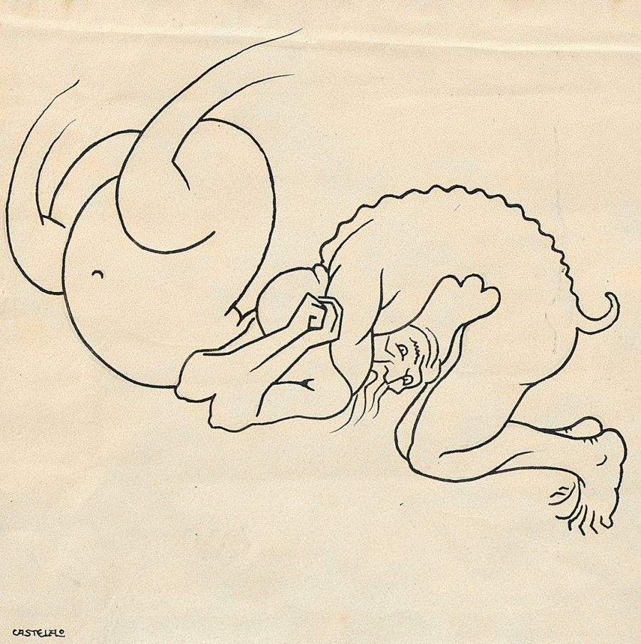 Dos figuras monstruosas, se pelean, enlazadas, revolcándose por el suelo. La viñeta está recortada y pegada sobre el papel que le sirve de soporte, en el que se encuentra escrito el texto.