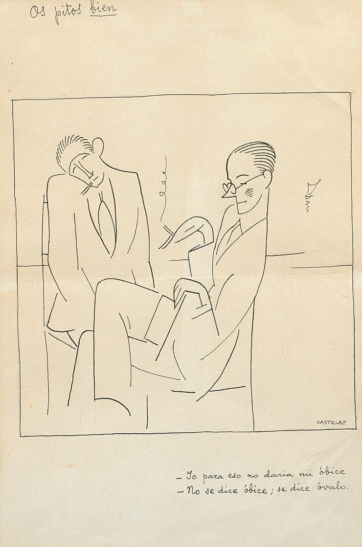 Es una escena al aire libre con dos tipos sentados, uno de frente con la cabeza inclinada sobre el hombro y un pitillo apagado en la boca, y el otro, a su lado, de perfil, con gafas y un cigarrillo echando humo en la mano. Al fondo se ve un barquito de vela. La sencillez del trazo espontáneo del dibujo se completa con el espíritu mordaz del texto.