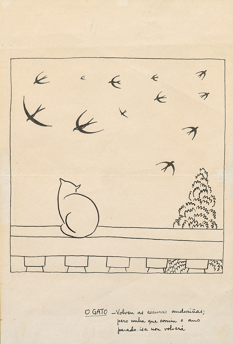 El protagonista es un gato, sentado de espaldas a nosotros, sobre la barandilla de una terraza, que mira hacia el cielo surcado de golondrinas y tiene un pensamiento que se recoge en el texto de la viñeta.