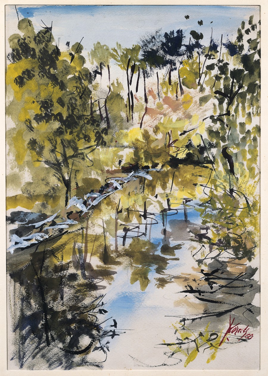 Trazos sueltos configuran, de forma esquemática, los árboles que bordean el cauce del río que ocupa el centro de la composición. La vista de la vegetación lo cubre todo dejando a penas atisbar el cielo. Amarillos, negros y verdes con algunos azules, producen sensaciones de luces y atmósfera, activadas por algunas reservas de papel blanco.