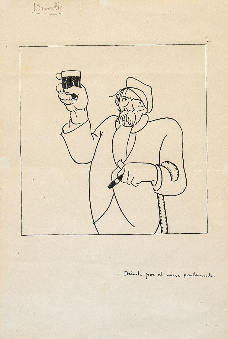 Con el bastón colgado del brazo y un aspecto descuidado, el personaje sostiene un vaso de vino en la mano derecha y un puro en la izquierda, mientras hace el brindis. La imagen cargada de énfasis transmite lo que el artista quiere expresar.