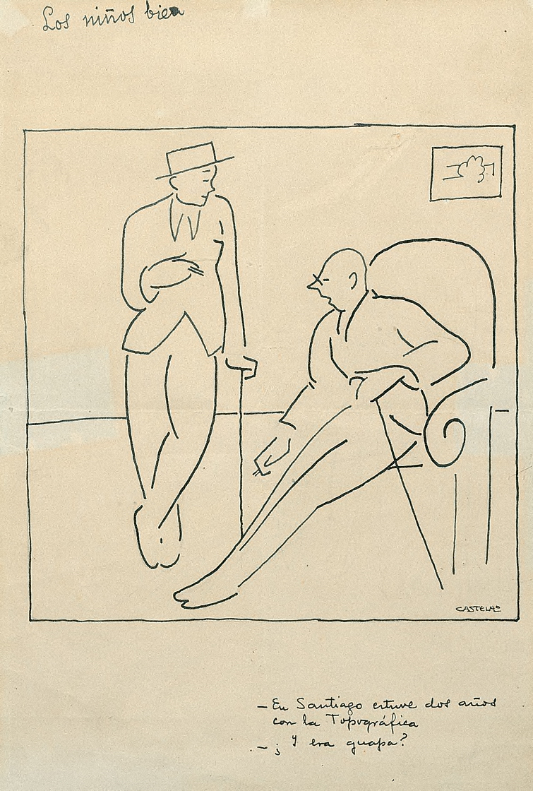 En el interior de una habitación, un tipo con bastón, sombrero y cigarro en la mano, está de pie ante otro, de más edad, calvo, que está sentado en un sillón, con las piernas estiradas. Un cuadro con un paisaje da ambiente a la estancia. Sus viñetas son como relatos de texto sintético que acompañan a una escena diseñada con dibujo esquemático y un encuadre en la composición que acusa la influencia de la fotografía.