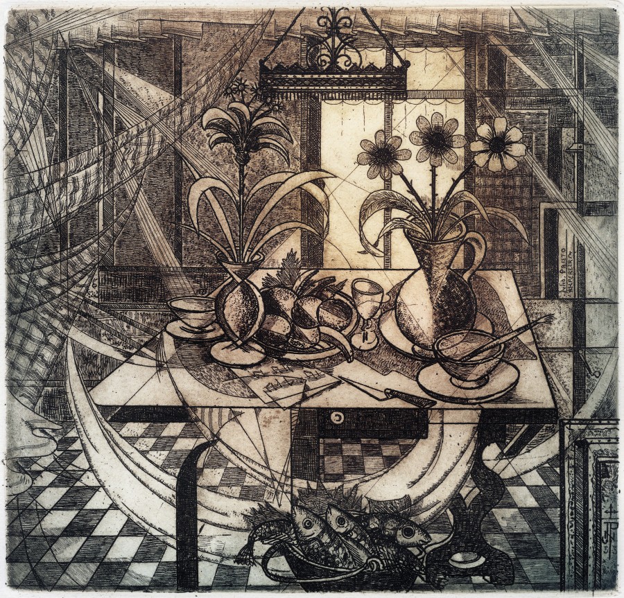 Partiendo de unas premisas deudoras de Cézanne combina sobre una mesa elementos característicos de un bodegón como platos con frutas, copas, cuchillos o un jarrón con flores, añadiendo en primer plano, en el suelo, un cesto con peces, sin que falte la cortina y la ventana e introduzca en el medio una partitura; todos son elementos reconocibles, y a pesar de cierto entramado cubista, se resiste a la tentación de la abstracción.