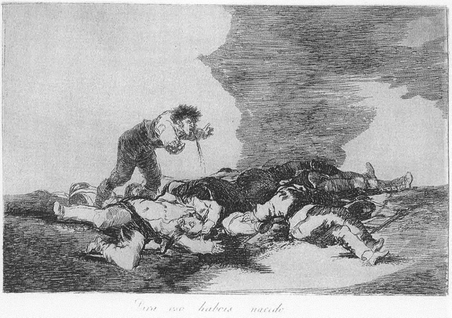 «Los Desastres» que Goya no llegó a publicar en vida, fueron realizados entre 1810 y 1820. En ellos plasma, el genial artista, de forma elocuente, la crueldad de la guerra, el hambre y la represión. Auna en la composición, el dibujo, la luz, el movimiento, el argumento y el tiempo en el que trascurre la escena que casi llegamos a percibir, como una secuencia cinematográfica, en algunas escenas como en la nº 15 «Y no hai remedio», la nº 26 «No se puede mirar», la nº 30 «Estragos de la Guerra» o la nº 41 «Escapan entre llamas».