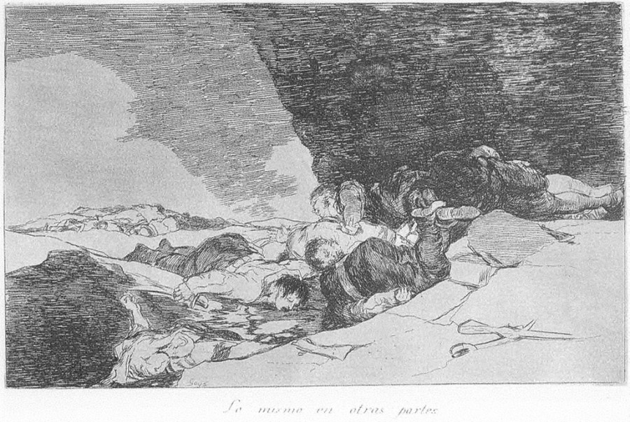 «Los Desastres» que Goya no llegó a publicar en vida, fueron realizados entre 1810 y 1820. En ellos plasma, el genial artista, de forma elocuente, la crueldad de la guerra, el hambre y la represión. Auna en la composición, el dibujo, la luz, el movimiento, el argumento y el tiempo en el que trascurre la escena que casi llegamos a percibir, como una secuencia cinematográfica, en algunas escenas como en la nº 15 «Y no hai remedio», la nº 26 «No se puede mirar», la nº 30 «Estragos de la Guerra» o la nº 41 «Escapan entre llamas».