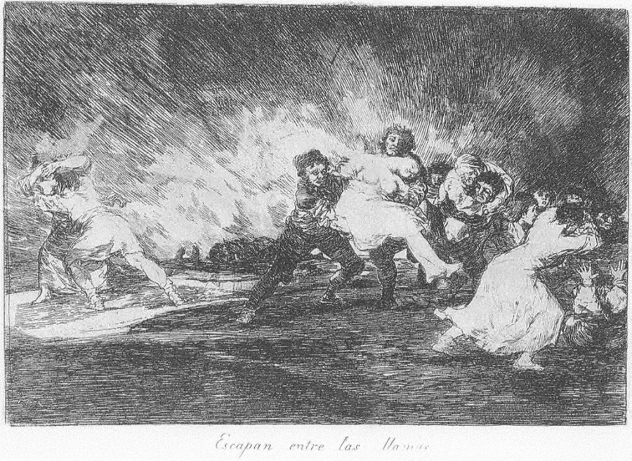 Un grupo de gente escapa de un incendio cuyas llamas iluminan la escena. Los gestos y cada uno de los detalles del conjunto son de una gran precisión. Según Lazló la estampa se refiere con toda probabilidad a la tragedia del pueblo de Torquemada, incendiado por el ejército de Lasalle camino de Valladolid.