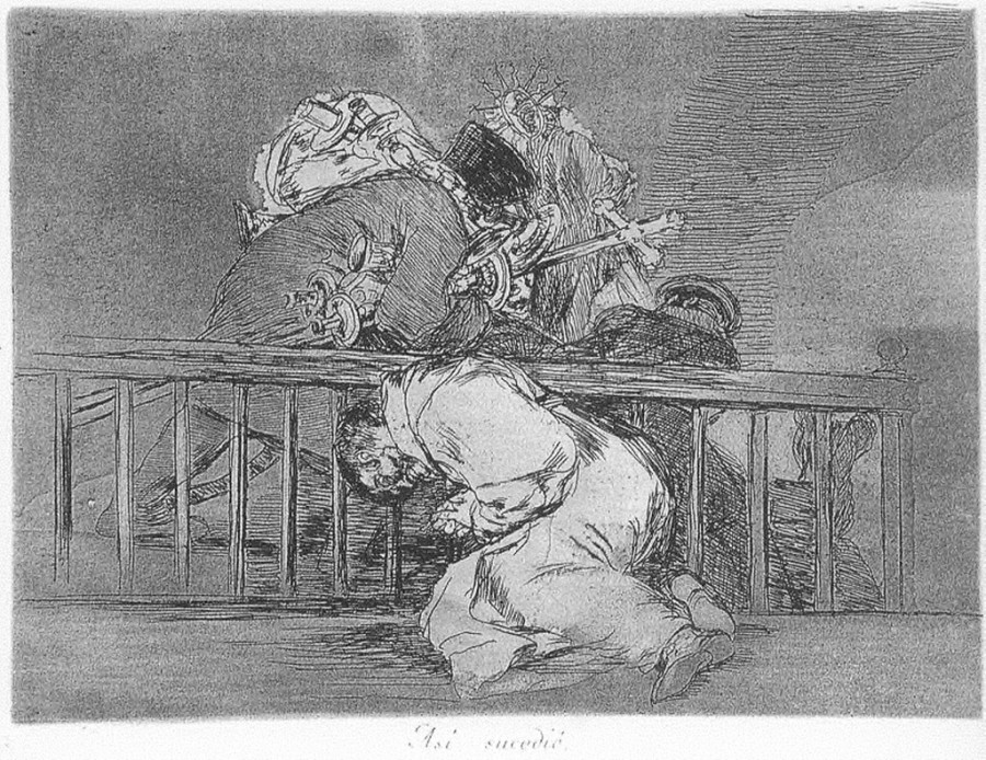 «Los Desastres» que Goya no llegó a publicar en vida, fueron realizados entre 1810 y 1820. En ellos plasma, el genial artista, de forma elocuente, la crueldad de la guerra, el hambre y la represión. Auna en la composición, el dibujo, la luz, el movimiento, el argumento y el tiempo en el que trascurre la escena que casi llegamos a percibir, como una secuencia cinematográfica, en algunas escenas como en la nº 15 «Y no hai remedio», la nº 26 «No se puede mirar», la nº 30 «Estragos de la Guerra» o la nº 41 «Escapan entre llamas».