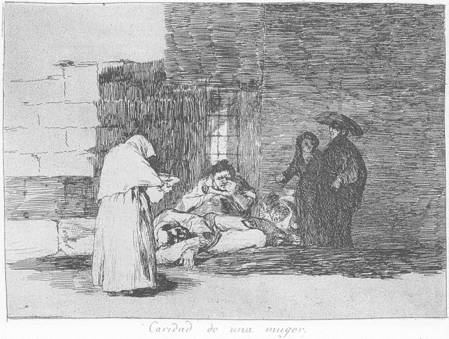 En una calle, sobre la acera, teniendo como fondo la pared de un edificio, una pareja de pobres son socorridos por una mujer que se acerca con un cuenco sobre un plato que sujeta con la mano. La escena se desarrolla delante de un cura y una señora que se ve en segundo término, entre sombras.