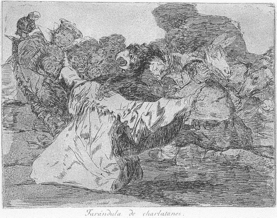 Seres, fruto de la fantasía, mitad humanos, mitad animales rodean a un ave que, vestida con hábito talar, gesticula.