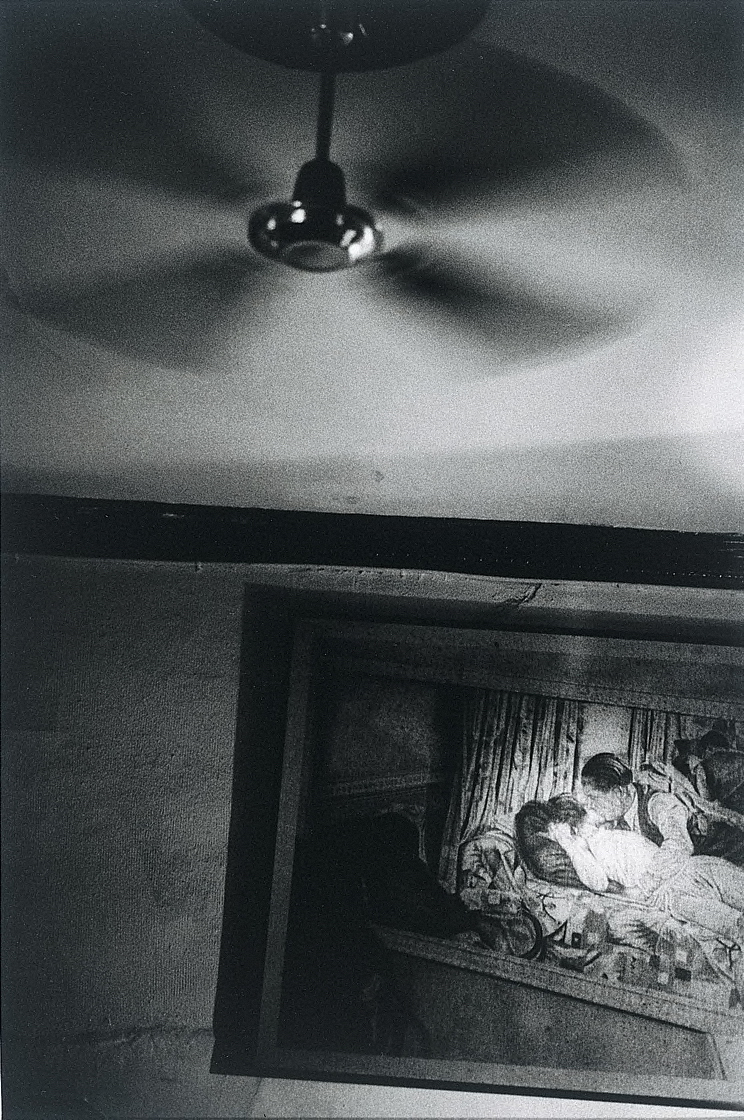 La imagen nos remite a una habitación con la estética de los años 30. Juega con la percepción de las cosas a través de una estructura de planos superpuestos y formas geométricas engarzadas con luces, sombras, reflejos, y un movimiento sugerido por el ventilador que cuelga del techo, en un juego que fuerza profundidades y fugas consiguiendo que la mirada llegue a lugares que parecen imposibles, como en una toma cinematográfica.Copia de autor.