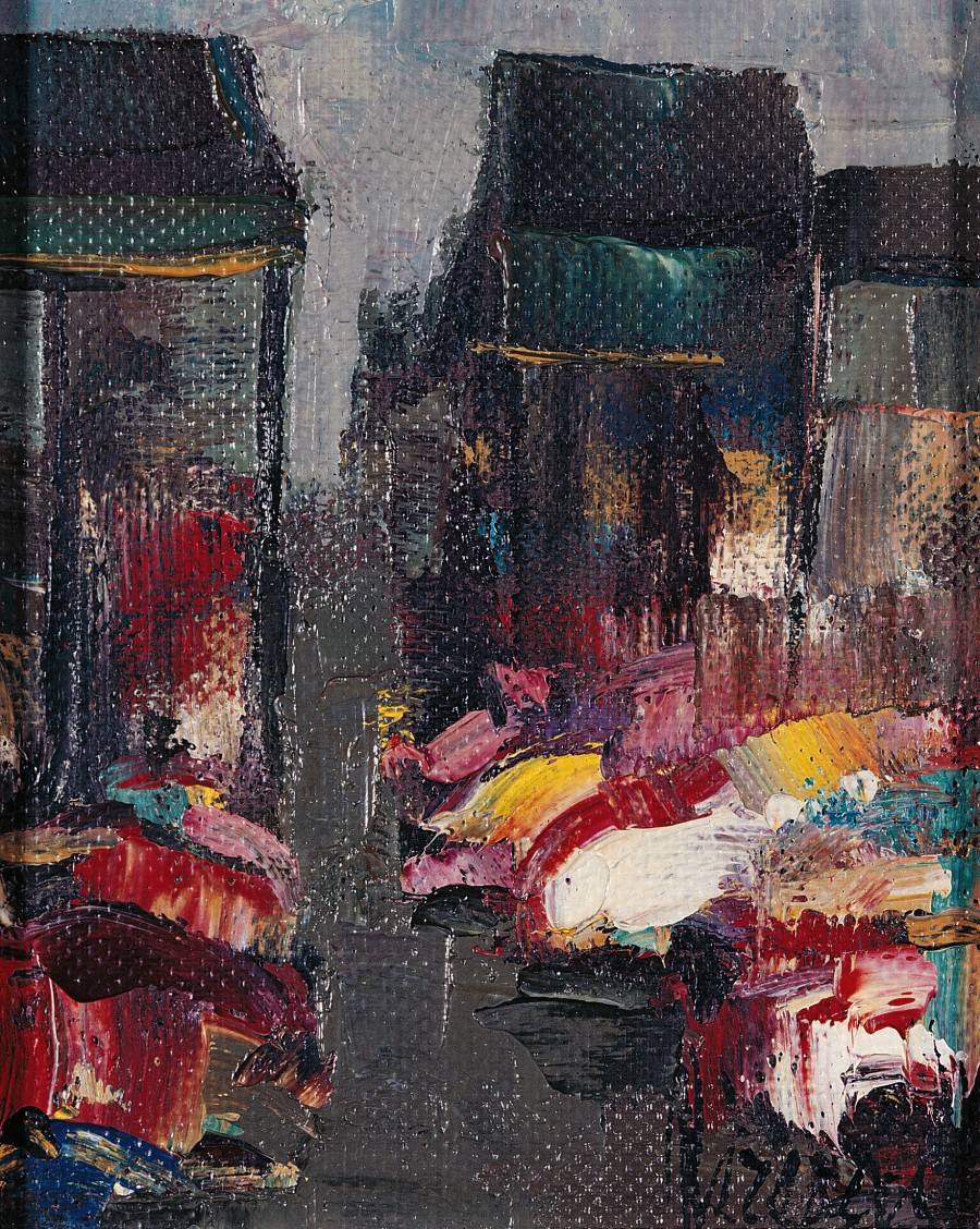 Perspectiva de una calle, abierta entre edificios, cuyas siluetas se recortan en la penumbra del fondo. Las flores, definidas con manchas de pasta, rojas, azules, blancas, amarillas y tejas, destacan en el primer término, dejando al descubierto, en algunas zonas, el punteado del táblex.