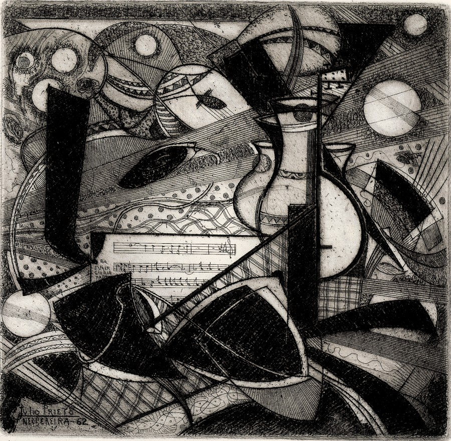 FLíneas rectas y curvas juegan, contruyendo formas que se yuxtaponen e invaden toda la plancha con el ritmo que marca la imaginación del artista. Destaca una partitura, peces, y líneas que se cruzan y multiplican en una composición movediza, con gradaciones y texturas características. Se forman como lucernarios blancos que retienen la luz e iluminan la estampa de forma inquietante.