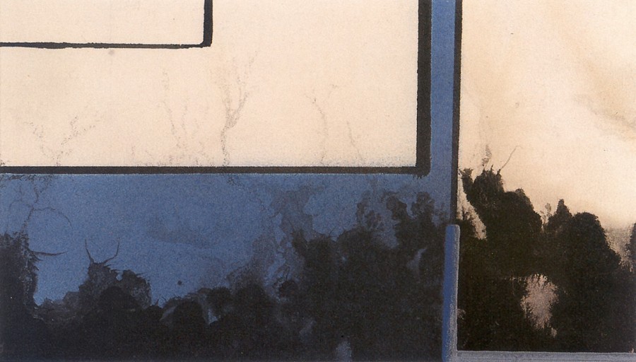 Organiza la composición con líneas verticales y horizontales que se juntan en un punto formando ángulos rectos. Sus lados llegan hasta el borde del cuadro, sugiriendo el fragmento de un espacio que continúa fuera del marco de la obra. Esta trama, tan simple, se equilibra con el color configurando un ámbito de carácter constructivo en armonía de negros, azules y ocres.