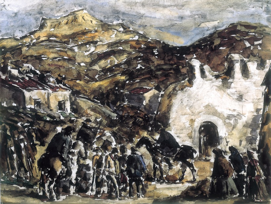 En un paisaje cerrado por montañas con escaso cielo, tiene lugar el suceso, protagonizado por grupos de personas y caballos, delante de las casas del pueblo. La escena está cargada de tensión que se agudiza por el empleo de un cromatismo de tonos verdosos, rojizos, negros y ocres sobre los que contrasta el blanco, que provoca como un fogonazo de luz sobre el ambiente sombrío de la escena.