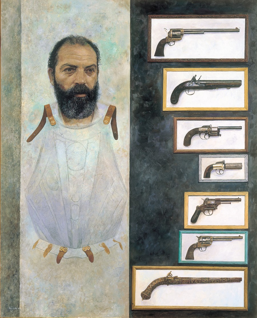 Al observar la composición hay algo que se nos escapa, que se queda oculto tras la imagen que vemos: una colección de armas ordenadas en un panel vertical y el retrato de un personaje que asoma por encima de una armadura del siglo XVI. Las posibilidades interpretativas son muchas, más que una lectura exige una complicidad con el autor. Algo emerge del subconsciente del creador con un tipo de planteamiento surrealista nuevo, ajeno a los postulados de Breton.