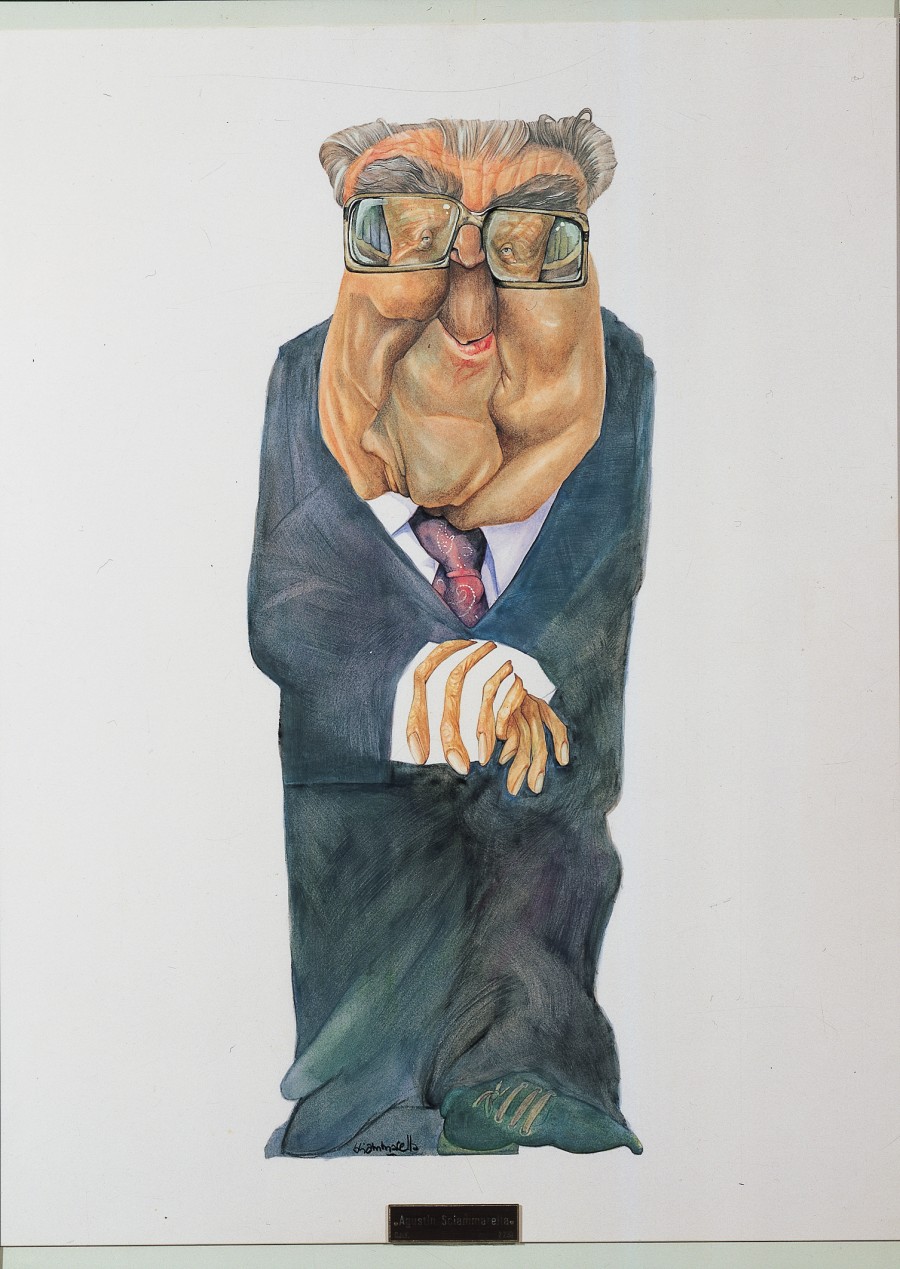 La figura del ilustre personaje, investigador, escritor, conferenciante y profesor de Lengua y Literatura, el pontevedrés José Fernando Filgueira Valverde, destaca de pie, de frente, vestido con traje y corbata, con una mano sobre la otra resaltando sus dedos sobre los blancos puños de la camisa. El personaje ha sido captado con la actitud y la expresión de un momento psicológico característico dejando plasmada en la caricatura su idiosincrasia.
