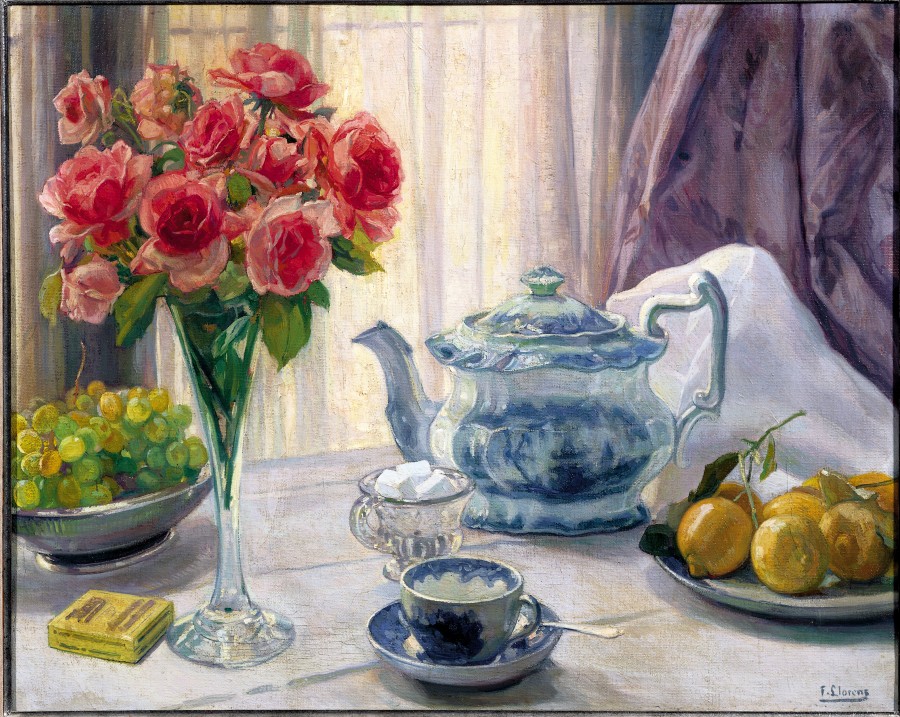 A contraluz, delante de la ventana, se disponen, de forma ordenada, una serie de objetos característicos de las composiciones de bodegón: un florero con rosas, uvas y limones agrupados en distintos recipientes, un servicio de café en el que no falta nada y una caja de palillos. Se recrea en las formas de las cosas, realzadas por el color y las sombras que provoca la luz que entra tamizada a través de la cortina transparente que cae sobre el cristal de la ventana. Utiliza como Cezánne el recurso de plegar el mantel blanco contra el cortinaje del fondo, que junto a la disposición oblicua de las tablas de la mesa, y el eje vertical del florero, distorsionan el espacio como si el bodegón estuviera pintado desde diferentes puntos de vista, con un concepto espacial con similitudes con la mirada cubista.Bibliografía