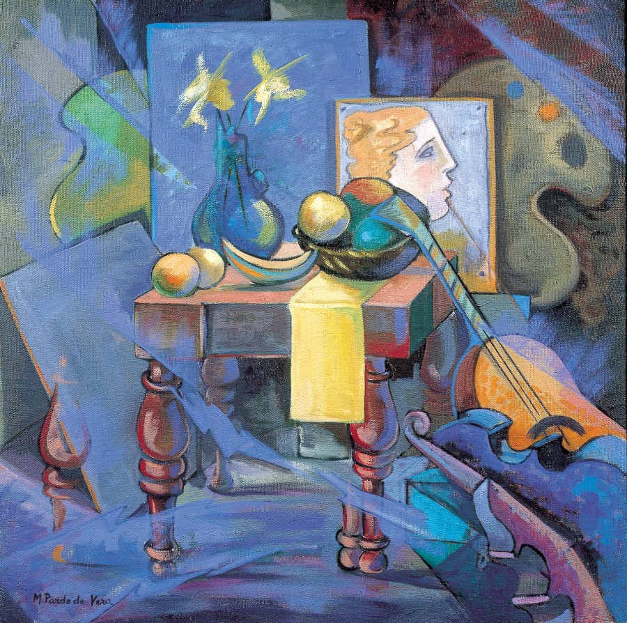 Instrumentos musicales, frutas, lienzos pintados y la paleta del artista que parece desdoblar el perfil de un retrato, aparecen ordenados en torno a una mesa de patas torneadas, en una atmósfera de azul transparente que envuelve a los objetos en un aura de ensoñación y misterio, con una idea transgresora, que va más allá de la realidad inmediata de unos objetos que se pueden encontrar en el taller de un pintor, abriendo un diálogo entre lo existencial y lo plástico.