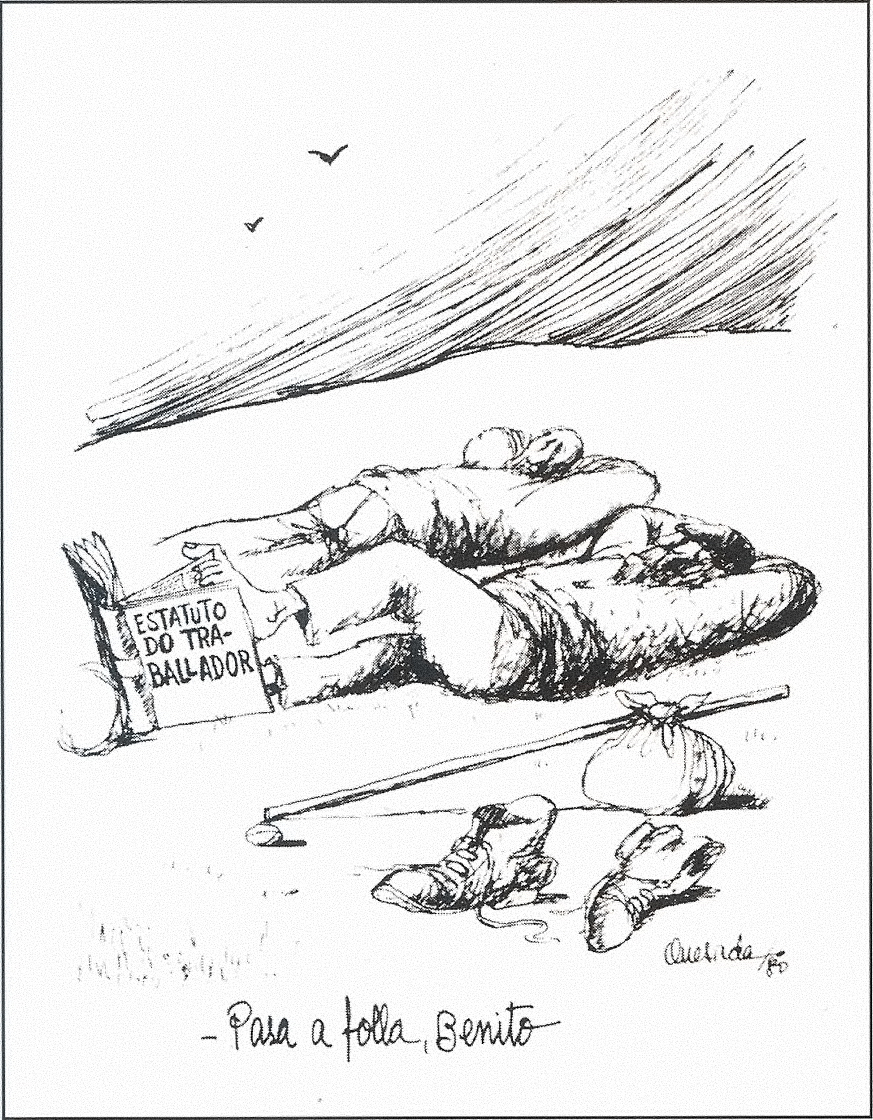 Dos figuras tumbadas en el campo, una de ellas, con los dedos de los pies descalzos, pasa las hojas de un libro "Estatuto do traballador". Delante, en primer término, unas botas y un hatillo. Con gran dominio de la composición y dibujo esquemático, perfila un tipo humano característico apoyándose en la anécdota, con elementos simbólicos y un acento irónico.