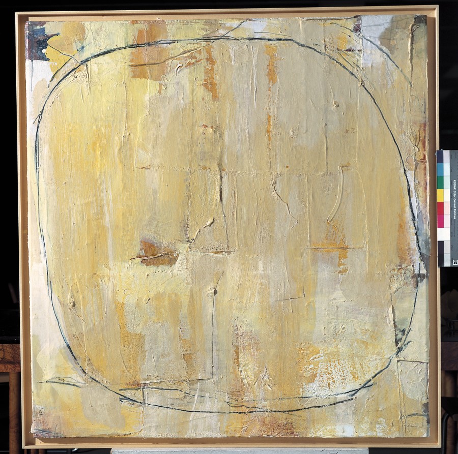 La madera es el soporte visible del lienzo convertido en un extraño vendaje, reducido a tiras, a jirones desordenados, pegados unos sobre otros, confiriendo un volumen real a la obra y erigiéndose en un agente expresivo de la misma, consiguiendo romper la uniformidad del intenso amarillo que disfruta de la variedad de matices lumínicos surgidos con el entrecruzado de las tiras.