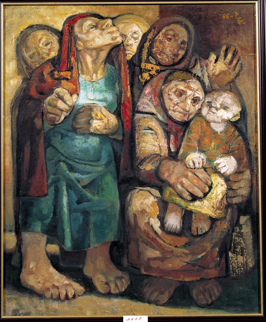 El tema de las maternidades ha sido abordado muchas veces por el autor imponiendo su estilo. Suelen ser imágenes, como en este caso, de expresión cansada y ajada, ausente de toda belleza física, alejándose de las tradicionales imágenes maternales.