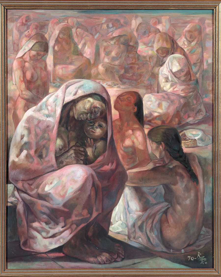 A su alrededor, figuras femeninas anónimas, casi invisibles, semicubiertas con paños o desnudas no consiguen desviar el punto de atención. La madre es el único personaje individualizado, su volumen está cuidado, el dibujo es más minucioso, de perfil definido, parándose en los detalles, concretando el rostro con una policromía más rica y estudiando su mirada.