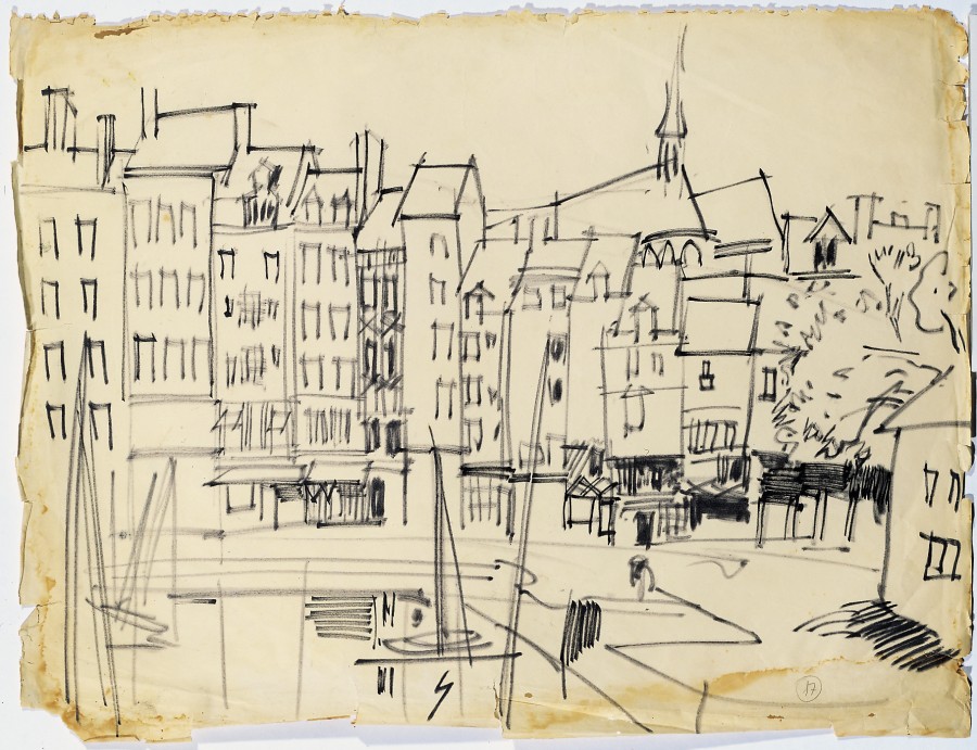 Rafael Alonso buscó en su estancia en Francia el contacto con el mar, con las zonas portuarias y sus dibujos de Honfleur son un ejemplo de ello. Este puerto pesquero había sido el más importante de Francia hasta que El Havre ocupó el primer puesto.En cada una de las composiciones, el autor ofrece una visión diferente y a la vez complementaria de la ciudad, de su puerto y de sus edificios.