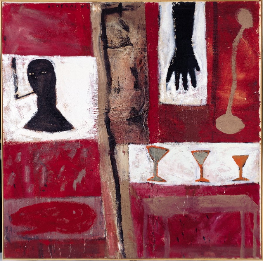 Sobre un fondo matérico, arenoso, con dominio de las tonalidades rojizas, se insertan, como ventanas abiertas, tres recuadros blancos con imágenes habituales en el código personal del autor. Las formas, interpretadas como siluetas, son reconocibles, una cabeza fumando una pipa, un brazo con una mano extendida, una mesa con tres copas de cristal... Los elementos representados son cotidianos y delatan acciones familiares, actos transitorios, como fumar donde, sin embargo, a través del humo está presente el implacable paso del tiempo.