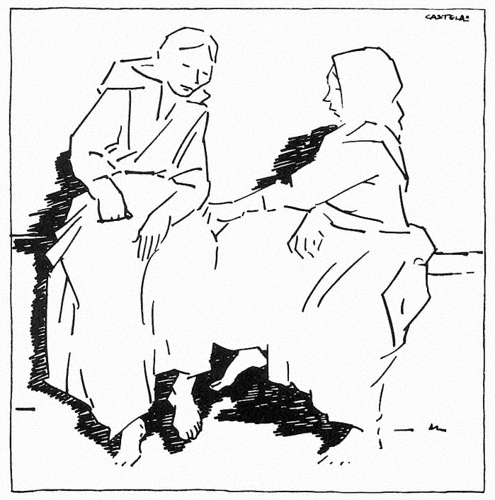 Con trazos enérgicos y líneas puras capta una instantánea de la vida diaria. Dos campesinas, sentadas, descalzas, en posturas contrapuestas, emiten su sentencia.Exposiciones