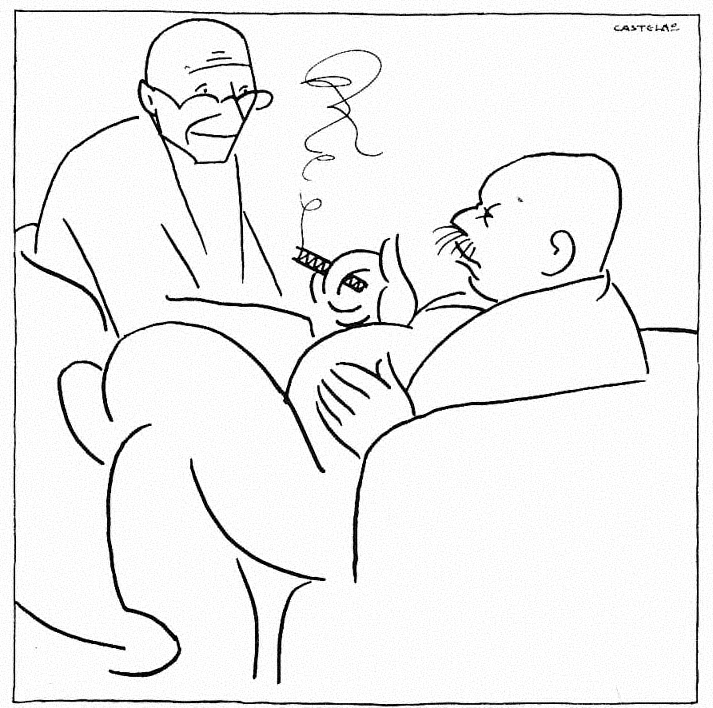 Con trazo incisivo y rápido exagera las curvas y la líneas angulares, precisando las siluetas de dos tipos diferentes, escuálido y con la frente surcada de arrugas, uno y encajado en un sillón, con barriga prominente, el otro.Exposiciones