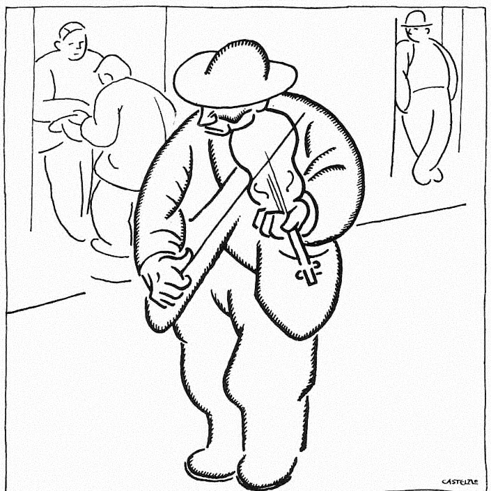 Conocedor de la técnica teatral, compone la escena con el ciego tocando el violín en primer término, y al fondo, como un decorado, figuras apoyadas en los marcos de las puertas a las que se acerca un personaje a recoger limosna.Exposiciones