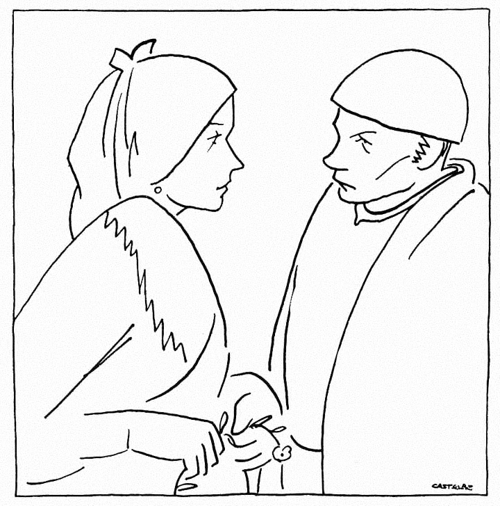 Dos figuras de medio cuerpo, una frente a la otra, con líneas finas, ilustran la respuesta ingeniosa a una pregunta comprometida, con la retranca del humor popular.Exposiciones