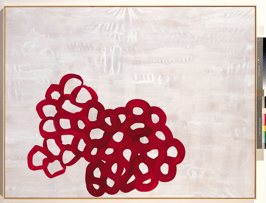 La fuerza del color avanza por la tela con levedad sin apenas manipulación confrontando la sensación entre lo lleno y lo vacío. La exaltación de unas formas redondeadas que recuerdan a la naturaleza surgen de la improvisación llenando de pequeños matices y tonalidades la obra. Manchas acuareladas como un torrente sanguíneo que discurren sobre un fondo blanco que no deja indiferente por su luz.