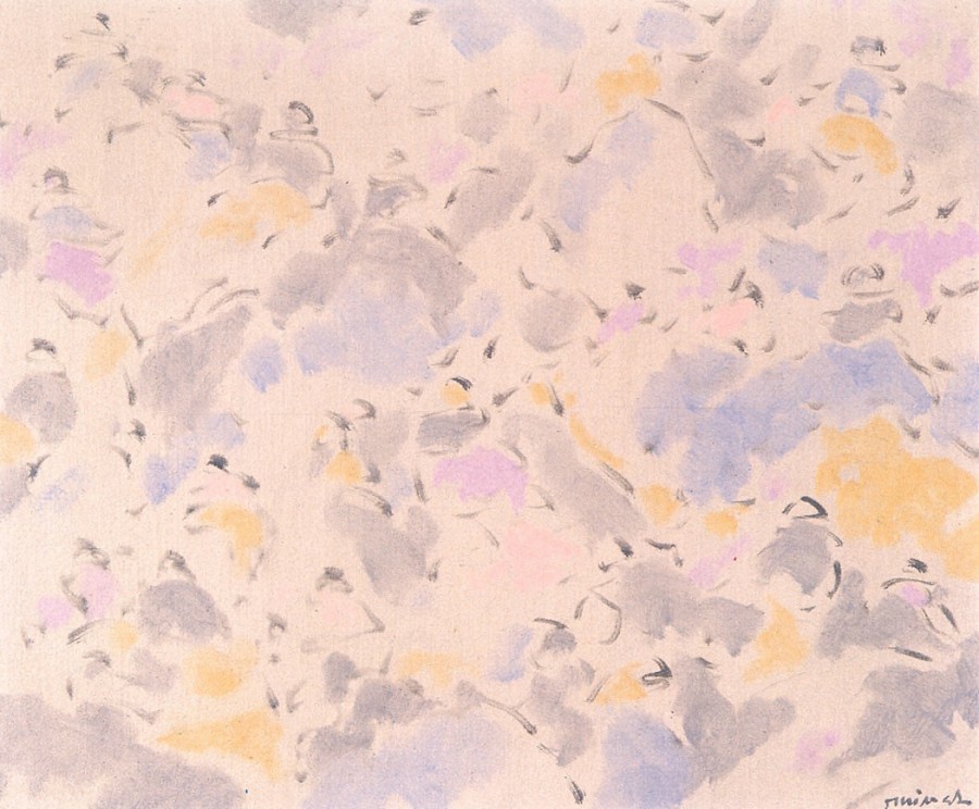 Organiza el espacio pictórico con trazos gestuales ligeros y manchas transparentes que, distribuidas con libertad, sin fórmulas preestablecidas, flotan ocupando toda la superficie de la tela. Ocres, amarillos, grises y rosas son la clave luminosa de un paisaje que, liberado de ataduras objetivas, plasma los juegos de la luz sobre las copas de los árboles, y, nubes movidas por soplos de viento. La pintura, abstracta, se sitúa en la línea de formas expresivas afines a la música y a la poesía.