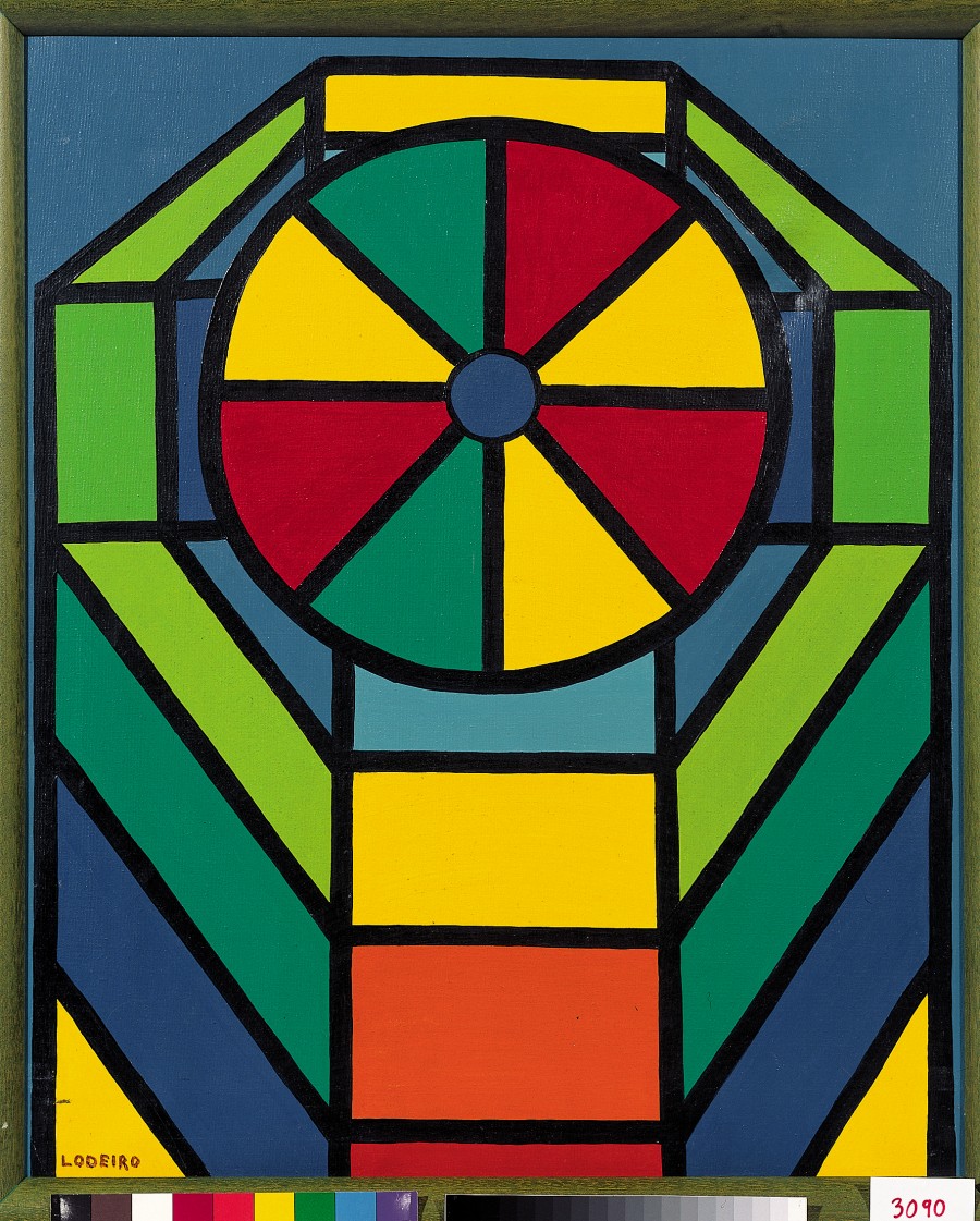 La rigurosa geometría estructura una composición donde los tonos cálidos dan paso a los fríos y cada color ocupa una casilla perfectamente delimitada por una gruesa línea negra. El círculo central, dominado por el núcleo azul, juega con los verdes, los amarillos y los rojos que no interrumpen el discurso de la gama de fríos, determinantes en el resto de la propuesta.