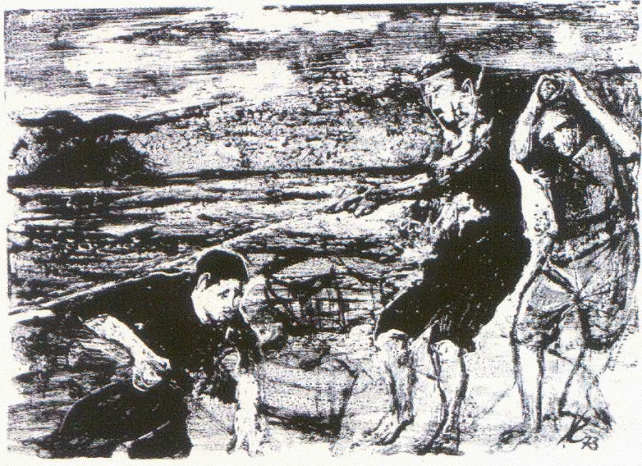 Capta, el artista distintos panoramas de la ciudad, sustrayéndose de la anécdota, valorando la arquitectura, que reproduce con personal diseño de líneas y sombras que imprimen un acento romántico al paisaje urbano. Resulta difícil no conmoverse ante algunos de estos decorados que la prisa o la costumbre nos han impedido definir, como la Plazuela en la que nace la Rúa de Santiago, con el simbólico olivo recortado sobre el mar, con las CÍes al fondo, en el Paseo de Alfonso; el edificio del antiguo Hotel Moderno, obra de Páczevich, en la pascaliana puerta del Sol; los edificios del cruce de Colón con Policarpo Sanz y García Barbón, el Banco Pastor y el conocido popularmente como casa Rubira, hoy ya desaparecido. En silencio nos obliga a reconocer la armonía de las plazas, monumentos y casas, testigos del pasado, rincones que acumulan recuerdos y que son algo así como nuestra reserva de tipismo. La Iglesia de Santa María, la concatedral, cuyas torres se alzan por encima de los tejados, asomando en la Plaza de la Constitución, en la de Almeida, y en la Rúa de San Vicente; el templo de San Francisco; en un ángulo de la ciudad perfilado sobre un cerro; el Puerto Pesquero en la Ribera, con el castillo del Castro al fondo; la calle de Pobladores, la calle Real; los soportales del Berbés; y el puerto deportivo, en el centro de la ciudad, con los jardines de «Las Avenidas» y los edificios de la calle de Montero Ríos al fondo. Veinticuatro grabados componen la serie «Xente do Mar» de formato apaisado, tamaño 20 x 29 cms. firmados todos, «XC» y fechados en el año 73. Con dibujo intuitivo, sin fórmulas determinadas, hace aflorar el vivir cotidiano de la gente del mar, sin desgarros ni estridencias, con una intensidad que se ve potenciada por el contraste de la tinta negra sobre el blanco del papel. Las escenas nos envuelven, lentamente, trasladándonos al entorno marinero, con imágenes articuladas en grupos, parejas y figuras aisladas, conjugando sensibilidad y fuerza expresiva con sorprendente seguridad de trazo. Una serie de elementos identificadores definen los temas: el transporte y arreglo de las redes; las distintas artes de la pesca y su variado aparejo; las reuniones de los hombres en la taberna; la espera; el reparto del pescado; la procesión del Cristo; y la íntima soledad de algunos personajes. Al verlos todos juntos, se produce un ir y venir de figuras, que se mueven con libertad, en un ambiente familiar con equilibrado ritmo de actitudes y matices psicológicos. M. L. I. J.
