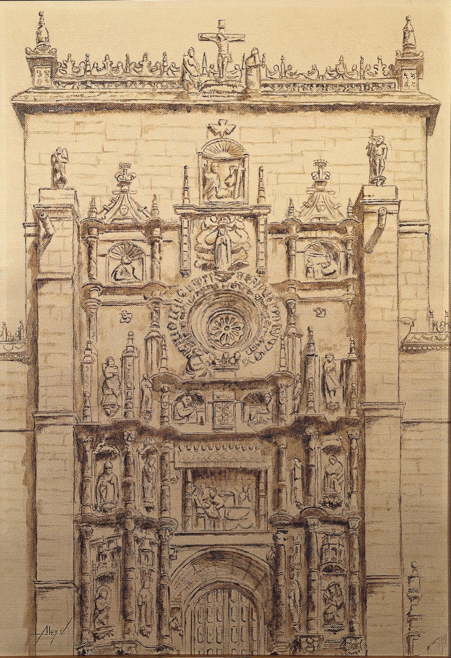 El autor fija los perfiles, encaja perfectamente cada elemento y cada detalle iconográfico es reconocible. Las variaciones lumínicas, que refuerzan la sensación de volumen, quedan descritas mediante un tostado diluido, menos intenso, que discurre por los paramentos reforzando los ángulos, recogiendo los matices de la piedra y las sombras proyectadas por la rica ornamentación escultórica.