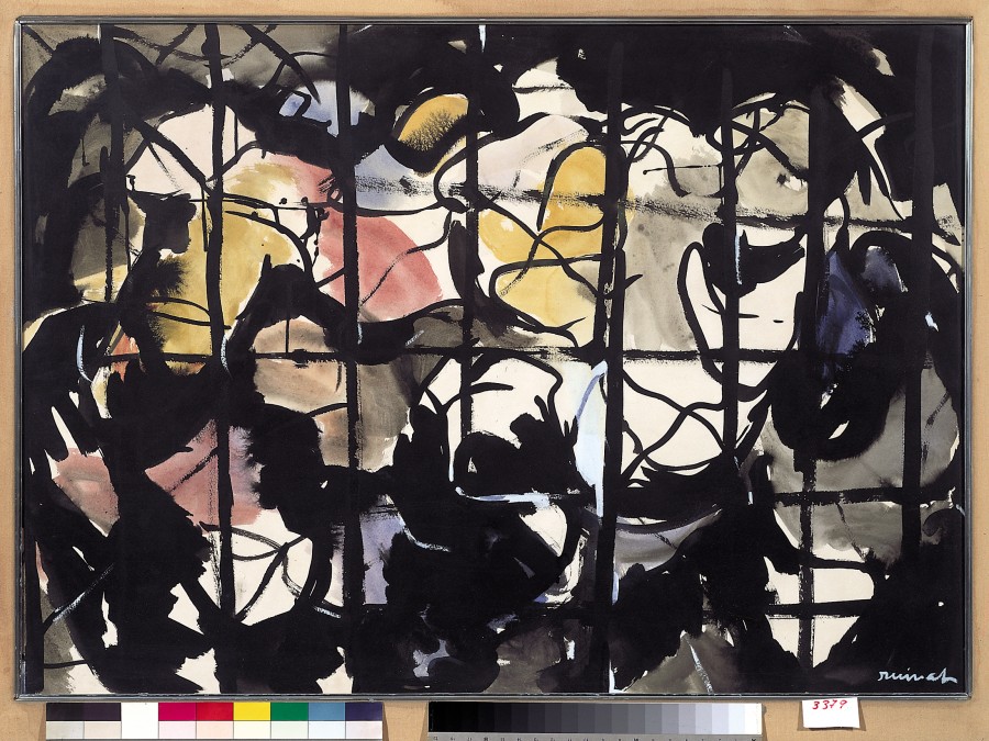 Es posible que las experiencias de su infancia determinaran la predilección por el color negro y la representación de mundos revueltos, desordenados, contenidos, como en este caso, dentro de férreas rejas.El negro puro e incidido es el tono dominante, el que diseña la malla reticular de la verja encerrando tras ella manchas de delicado cromatismo. Los amarillos, los rosas y los azules componen una atmósfera llena de nubes y de sueños de colores que provocan un contraste visual en la composición, acentúan la sensación de prohibición y encierro al enfrentar la ternura de los pasteles con la negatividad azabache. La dualidad semántica se intuye también en la configuración de la obra, en la convivencia de línea y gesto, de disciplina y libertad, en una lucha en la que, finalmente, se impone un sentido de lo lírico y lo caligráfico de clara inspiración oriental.