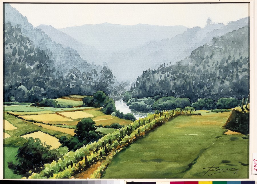 La investigación en el paisaje gallego, en los diferentes verdes que mudan de tonalidad a lo largo de las estaciones es un tema que apasiona al autor que entiende la acuarela como un medio para el análisis y la compresión del mundo.Los campos geométricos y humanizados, de múltiples matices verdosos, dan paso a las lomas que revelan la grandiosidad del entorno, del valle que continúa más allá de la imaginación y se pierde en una masa de suaves azules que se van diluyendo en la distancia. La transparencia de las aguas del río se consigue interpretando el blanco del papel como color, manteniendo un espacio puro en el centro de la composición que delimita la frontera entre los dos ámbitos, entre el dominio del hombre y la inmensidad de la naturaleza.
