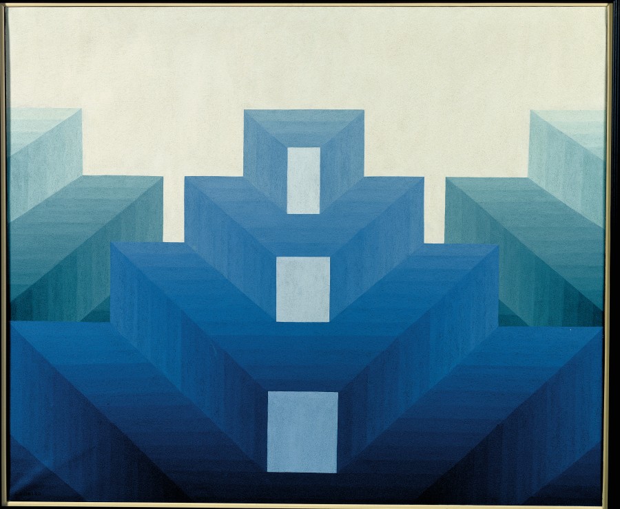 Construcción geométrica recortada sobre un fondo luminoso, en un espacio abierto a una nueva dimensión cuya clave debemos desentrañar nosotros. La luz rompe el rigor rectilíneo difundiendo un temblor por la superficie pictórica, con sensaciones de movimiento logradas con gamas de azules, verdes y amarillos. El perfil escalonado de la estructura recuerda el motivo de la greca decorativa del arte mejicano.Exposiciones