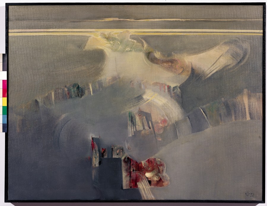 Esta obra de Antonio Quesada, paisajista de raíz intelectual, presenta un espacio mágico de sentimientos y sensaciones.La visión abstracta de un paisaje de pincelada suelta y ligera, lleno de veladuras y transparencias que se organiza en ritmos ondulantes y envolventes que desdibujan un territorio a través de un equilibrado juego de tonalidades. Colores suaves como el gris, el rosado y el azulado con toques de rojo, amarillo y verde para crear un espacio que se confunde con un ir y venir de luces y sombras. El viento parece que azota el lienzo, arrasando un lugar de construcciones fantásticas y dejando sólo estable un horizonte donde un amanecer cubierto despierta un nuevo día.