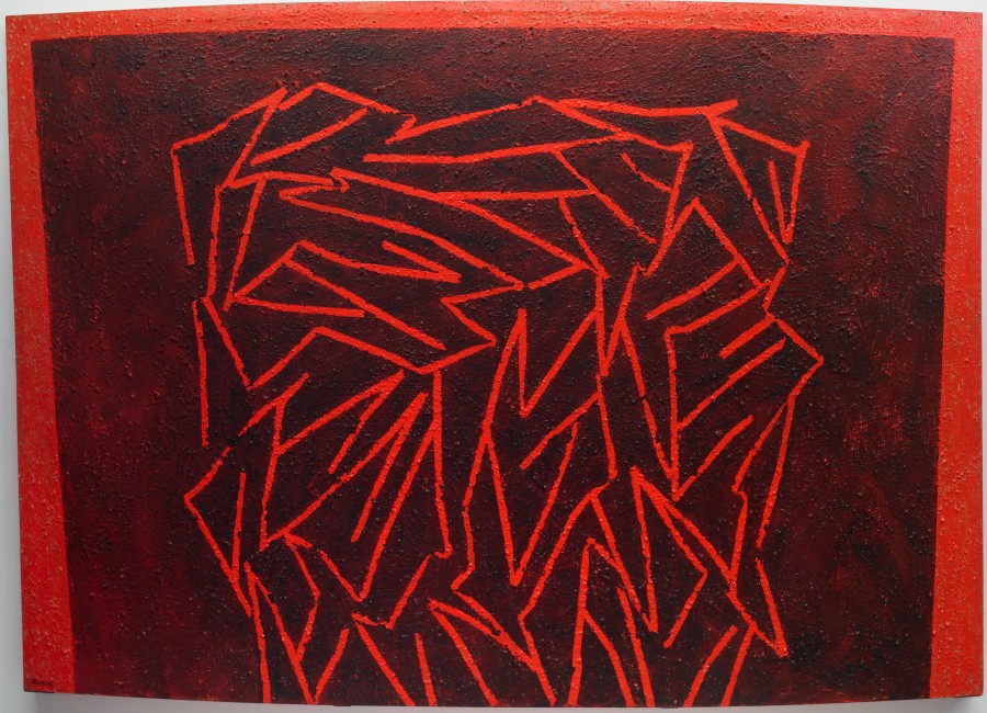 En esta obra de Ruibal se hacen más presentes que nunca sus tres elementos definitorios y personales: el tratamiento del color, las texturas y el protagonismo de la línea. Una obra de gran tamaño que juega con la curva del lienzo para salir en la búsqueda del espectador.Formas esquemáticas de un rojo intenso se expanden con espontaneidad y son la clave para crear un paisaje que plasma pensamientos propios. Uso monocromático del color. El rojo inunda el espacio en diferentes tonalidades haciéndose más protagonista en aquellos elementos que el autor quiere potenciar.